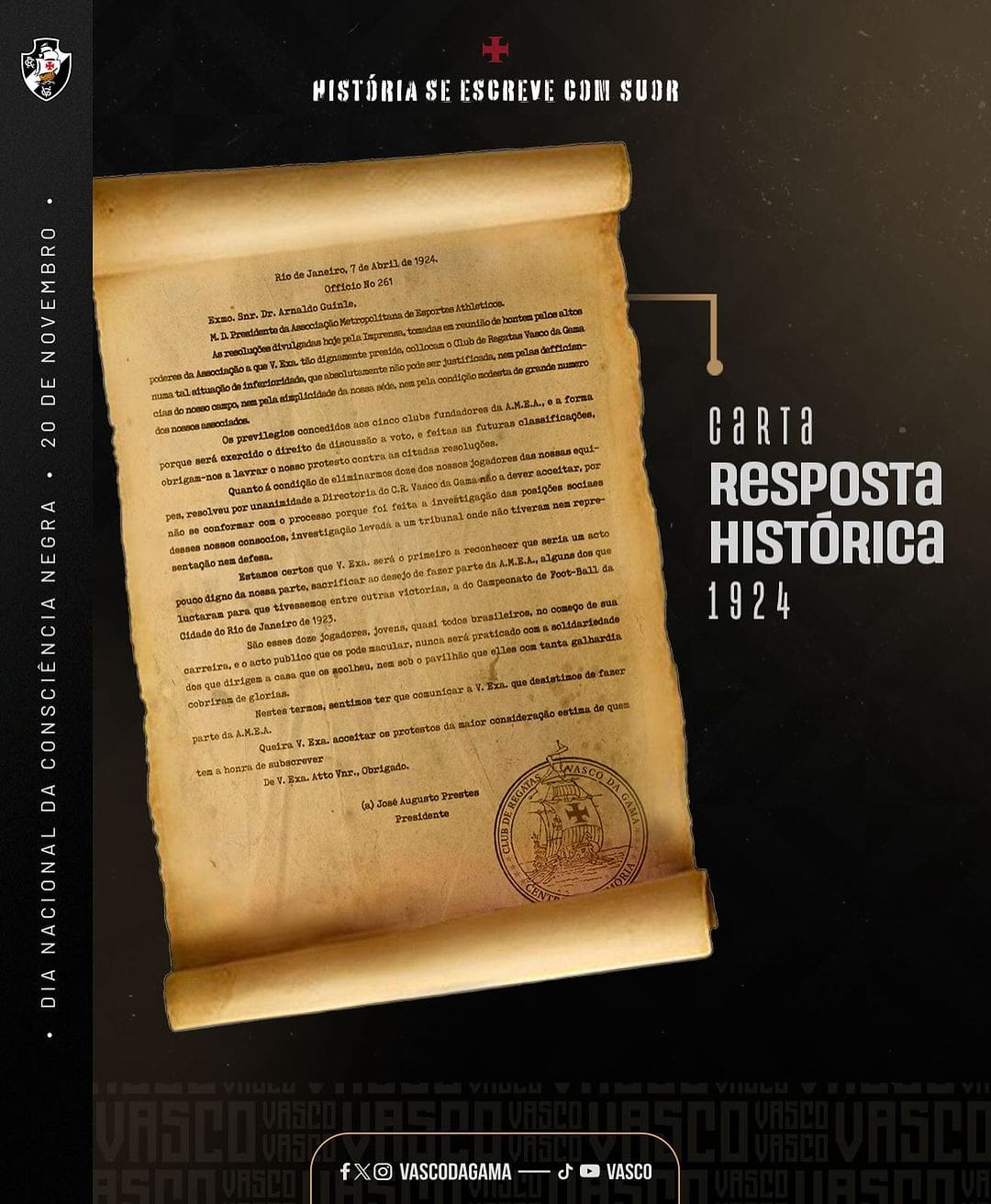 No Dia da Consciência Negra, o Vasco reaviva a Memória Histórica; confira a publicação. quarta-feira, 20/11/2024 às 12:58 — Em Últimas notícias