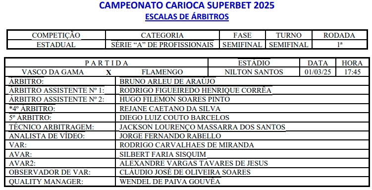 Bruno Arleu de Araújo será o árbitro do jogo entre Vasco e Flamengo; Rodrigo Carvalhaes de Miranda terá a função de VAR. sábado, 01/03/2025 às 05:06 — Em Últimas notícias