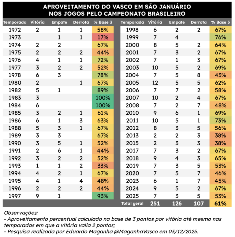 Veja a performance do Vasco em São Januário no Campeonato Brasileiro desde 1972. quinta-feira, 04/12/2025 às 02:37 — Em Últimas notícias