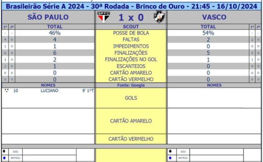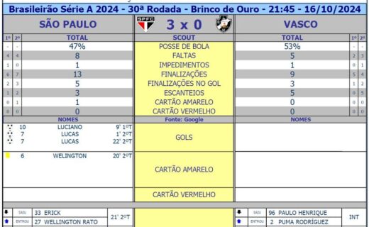Confira as estatísticas do jogo São Paulo 3 x 0 Vasco. quarta-feira, 16/10/2024 às 23:43 — Em Últimas notícias