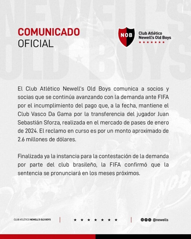 Newell’s Old Boys inicia processo contra o Vasco na Fifa devido a atraso no pagamento de Sforza. segunda-feira, 28/04/2025 às 11:31 — Em Últimas notícias