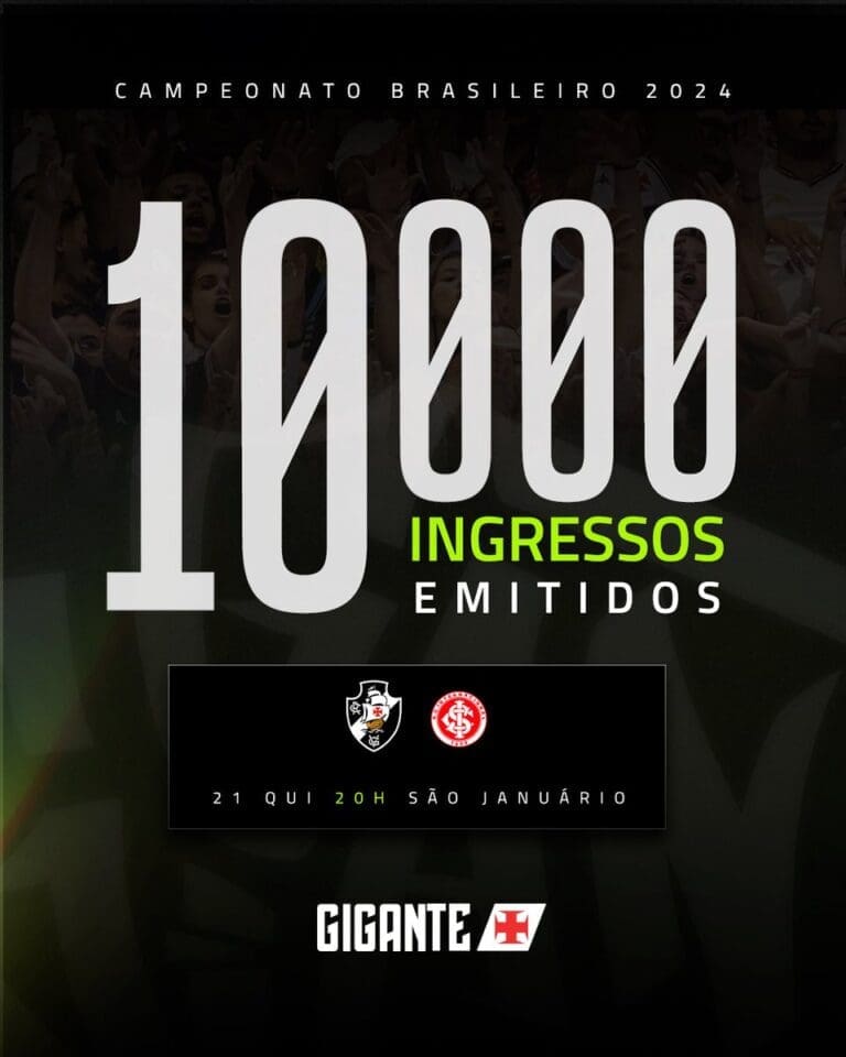 “Em uma expectativa crescente, já foram vendidos 10 mil ingressos para o aguardado duelo entre Vasco e Internacional. A partida promete agitar os torcedores e fortalecer a rivalidade entre os clubes. Não fique de fora dessa grande competição!”