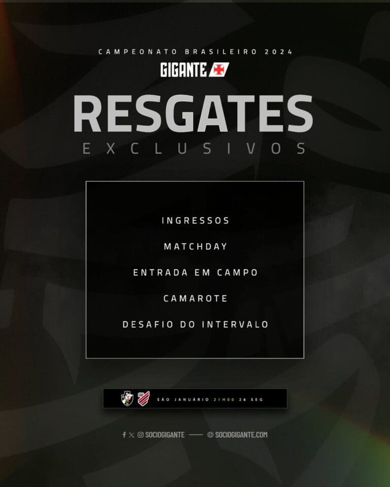 Os sócios do Vasco terão a oportunidade de garantir seu resgate para o jogo contra o Athletico-PR no Brasileirão. A partida está marcada para esta sexta-feira às 18h. Não