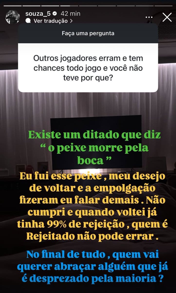 Souza reconhece que foi arrogante ao afirmar que iria ‘sobrar’ no futebol brasileiro. domingo, 18/05/2025 às 02:08 — Em Últimas notícias