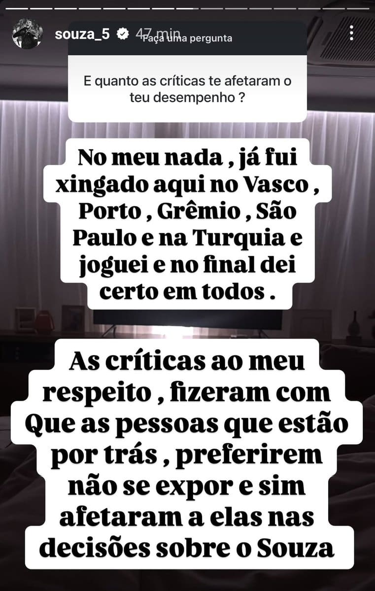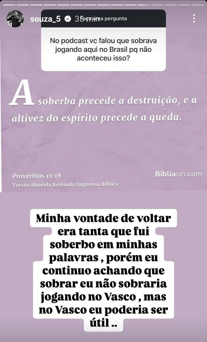 Souza aborda a escassez de oportunidades e a fase atual do Vasco em suas publicações no Instagram. sábado, 17/05/2025 às 10:05 — Em Últimas notícias