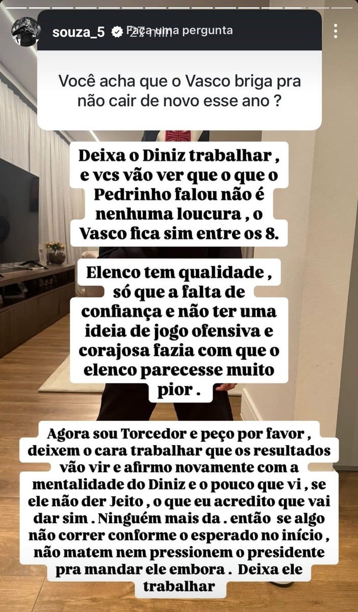 Em publicações no Instagram, Souza discute a escassez de oportunidades, a fase do Vasco e a análise sobre Fernando Diniz. sábado, 17/05/2025 às 10:10 — Em Últimas notícias