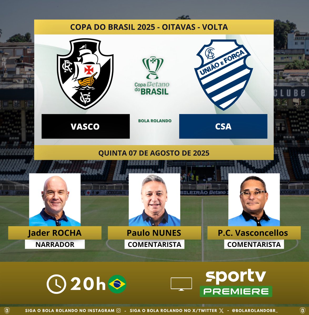 Conheça os especialistas que estarão na transmissão de Vasco x CSA pela televisão. quinta-feira, 07/08/2025 às 10:51 — Em Últimas notícias
