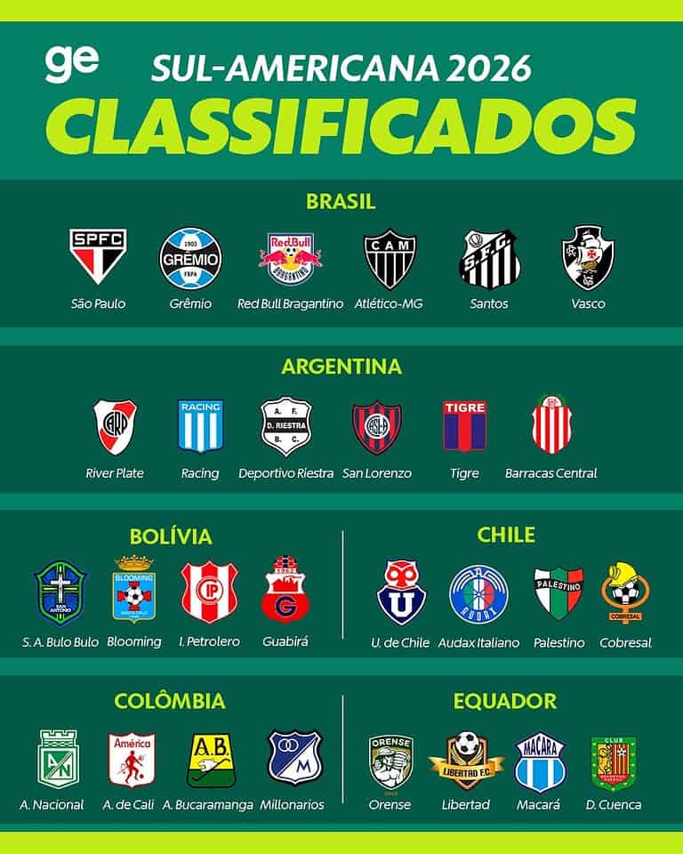 Sul-Americana 2026: confira os times confirmados, entre eles River Plate, Racing e San Lorenzo segunda-feira, 22/12/2025 às 01:59 — Em Últimas notícias
