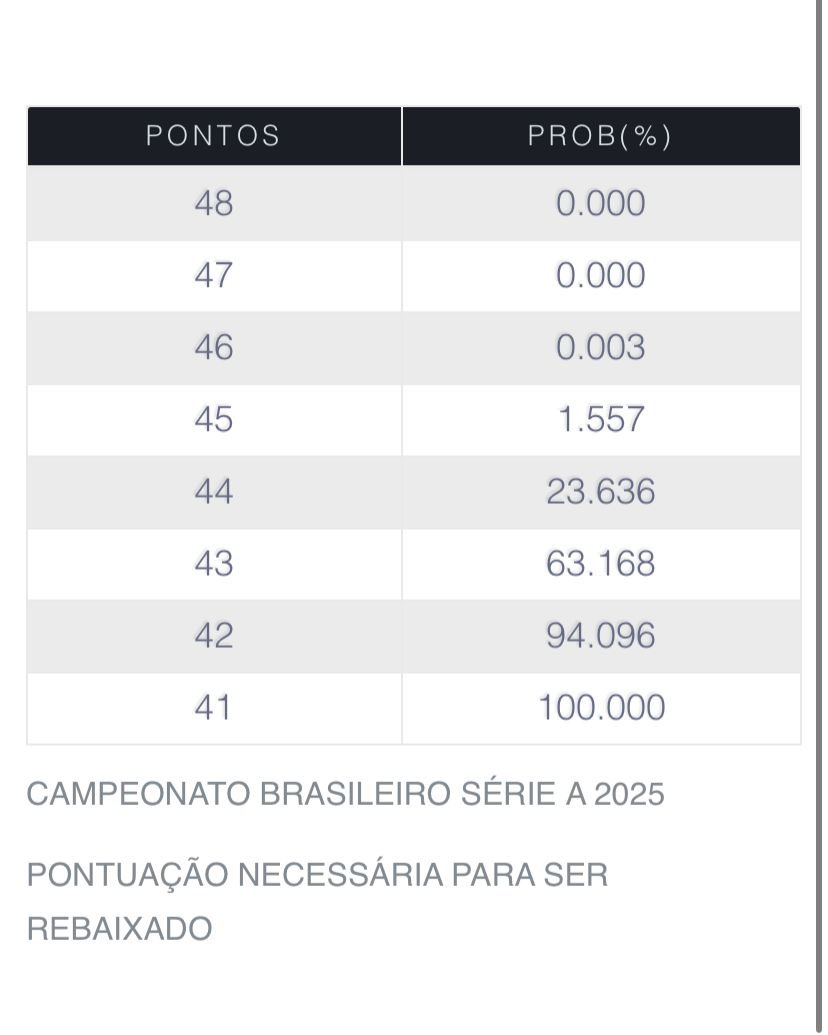 Vasco possui uma probabilidade de rebaixamento de 0,02% a 0,04%, de garantir uma vaga na Sul-Americana de 84,45% a 85,8% e de 6,27% de alcançar o G8. segunda-feira, 01/12/2025 às 00:54 — Em Últimas notícias