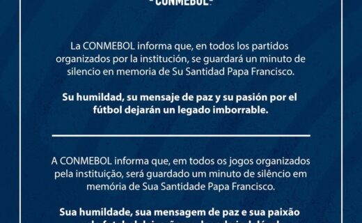 Conmebol declara que partidas da Sul-Americana terão 1 minuto de silêncio em tributo ao Papa Francisco terça-feira, 22/04/2025 às 15:22 — Em Últimas notícias
