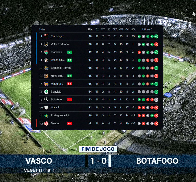 Veja a classificação final da Taça Guanabara: Vasco finaliza em 4º lugar e enfrentará o Flamengo na semifinal do Carioca. domingo, 23/02/2025 às 20:50 — Em Últimas notícias