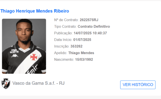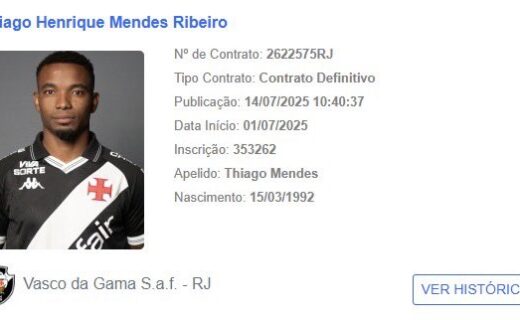 Thiago Mendes é oficialmente apresentado: ‘Vejo que o Vasco está em evolução, apenas vai progredir’ quinta-feira, 17/07/2025 às 14:03 — Em Últimas notícias