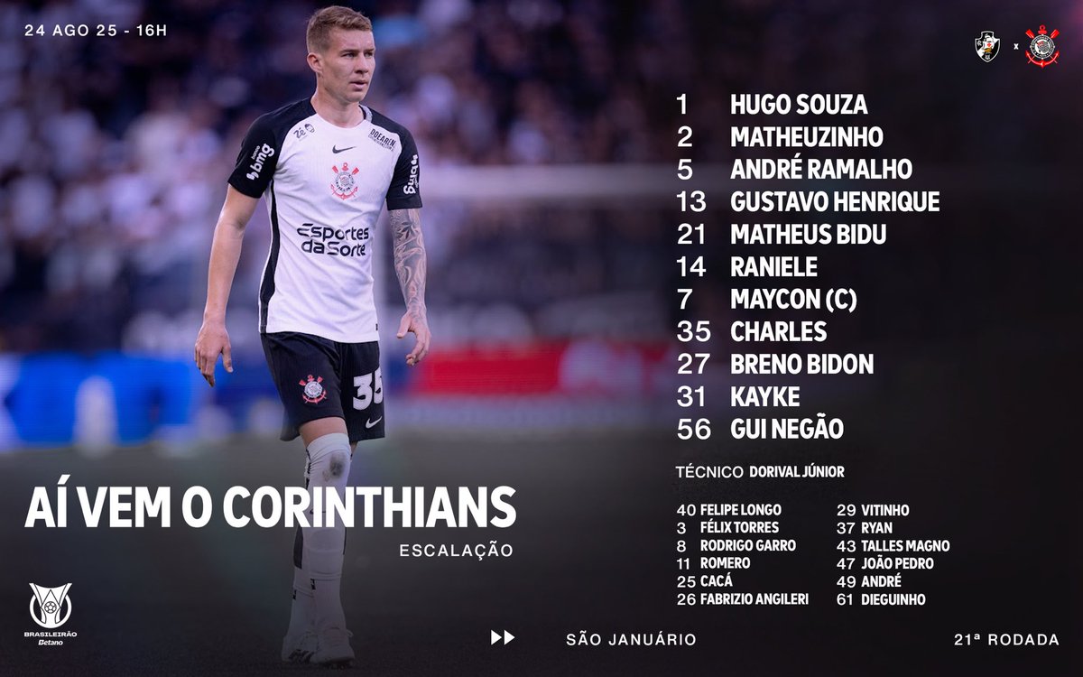 Confira a formação do Corinthians para a partida contra o Vasco; o vascaíno Talles Magno está no banco como alternativa. domingo, 24/08/2025 às 15:12 — Em Últimas notícias
