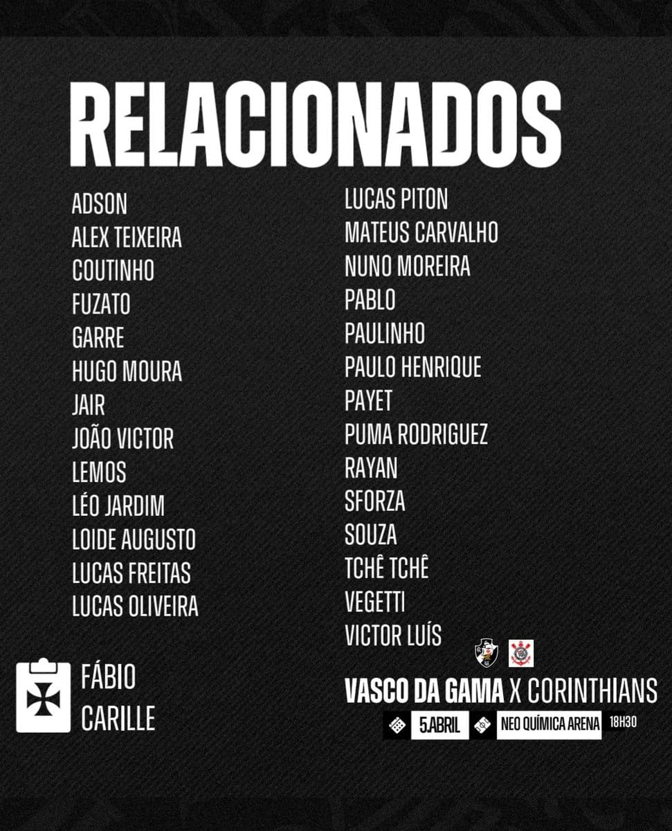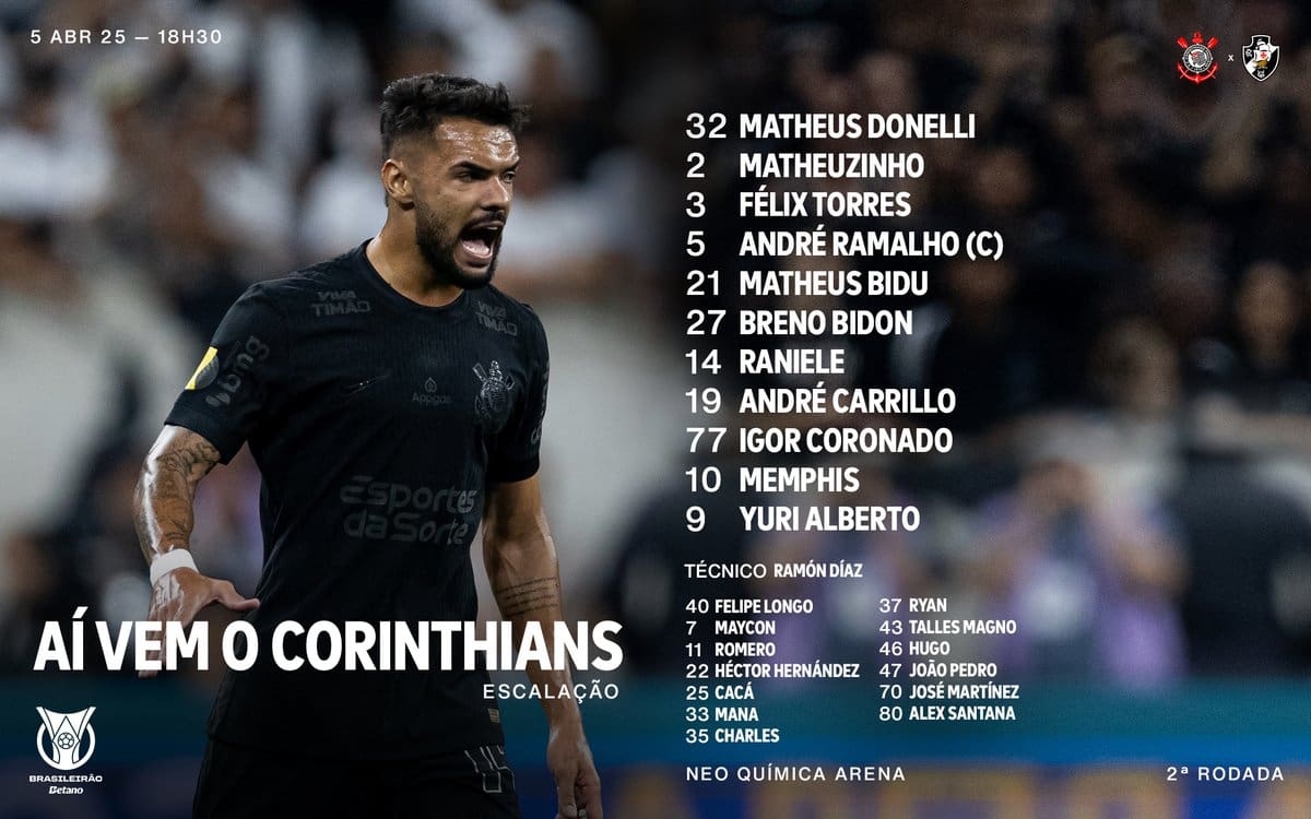 Veja a formação do Corinthians para o confronto contra o Vasco. sábado, 05/04/2025 às 17:44 — Em Últimas notícias