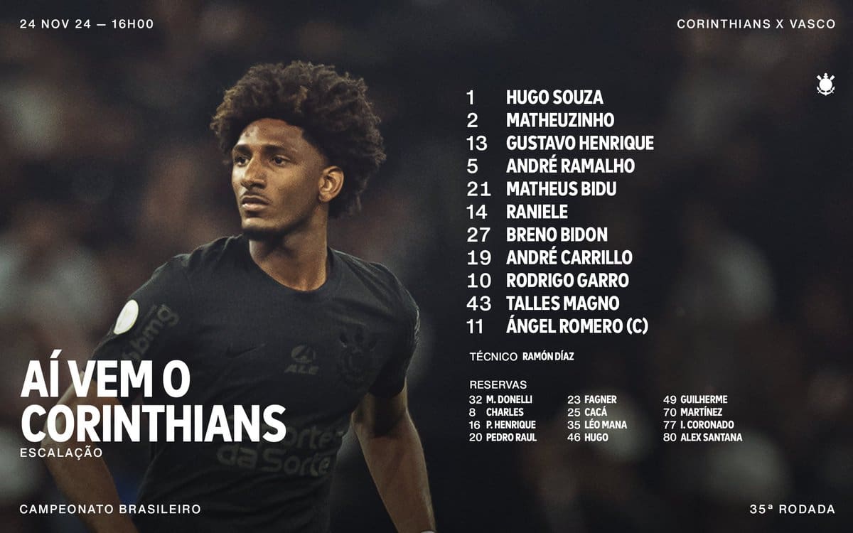 Veja a escalação do Corinthians para a partida contra o Vasco; Talles Magno, criado nas categorias de base do Vasco, é um dos titulares. domingo, 24/11/2024 às 15:08 — Em Últimas notícias