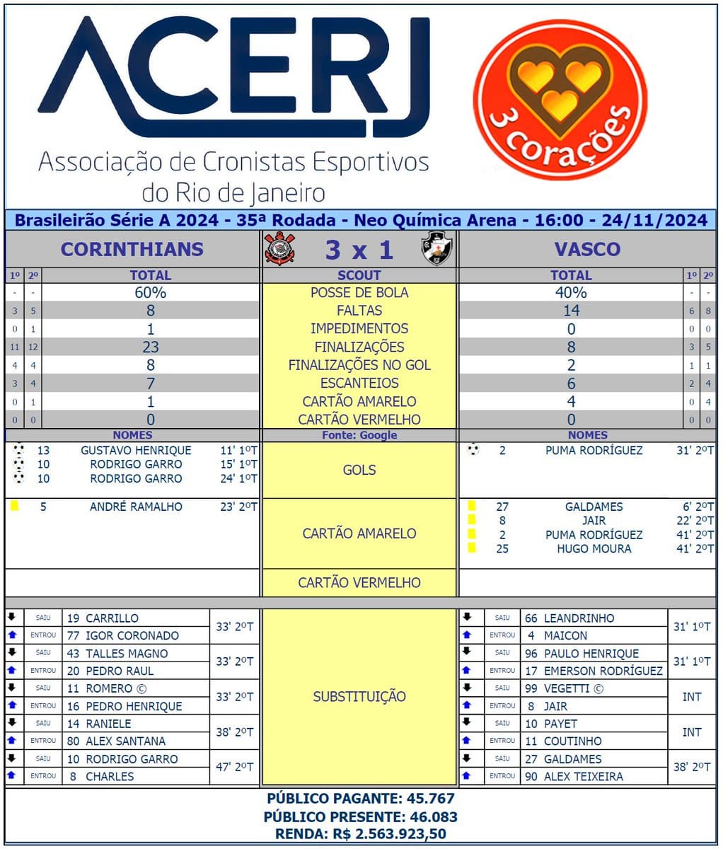 Confira as estatísticas do jogo Corinthians 3 x 1 Vasco domingo, 24/11/2024 às 18:00 — Em Últimas notícias