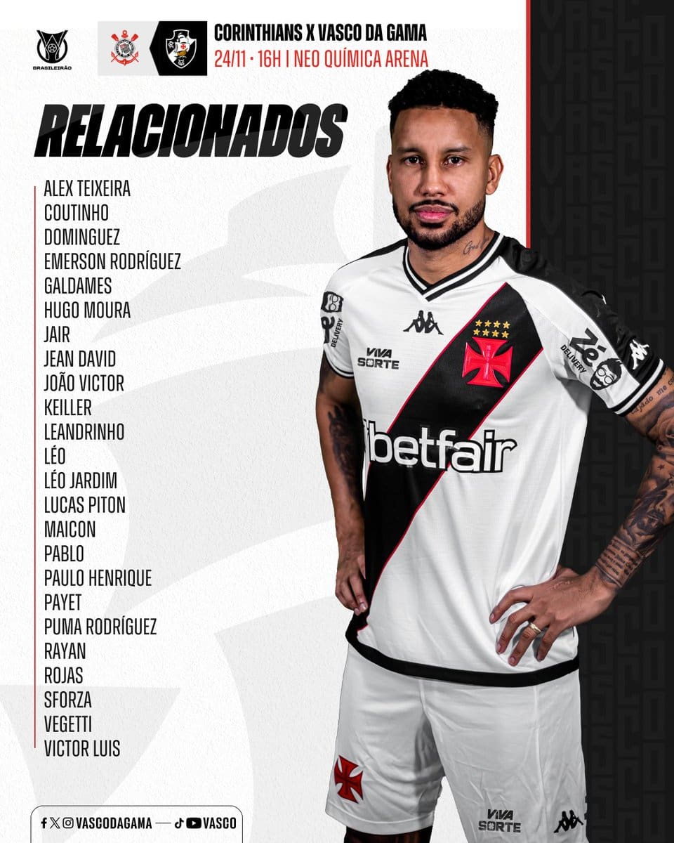 Vasco anuncia a lista de jogadores convocados para o confronto contra o Corinthians. sábado, 23/11/2024 às 13:15 — Em Últimas notícias