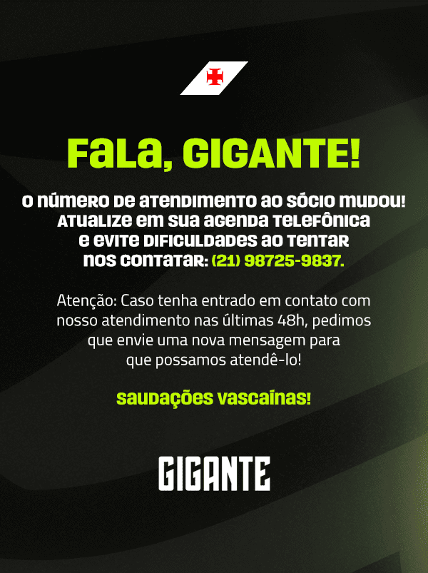Vasco comunica o novo número de atendimento do Sócio Gigante quinta-feira, 22/08/2024 às 15:32 — Em Últimas notícias