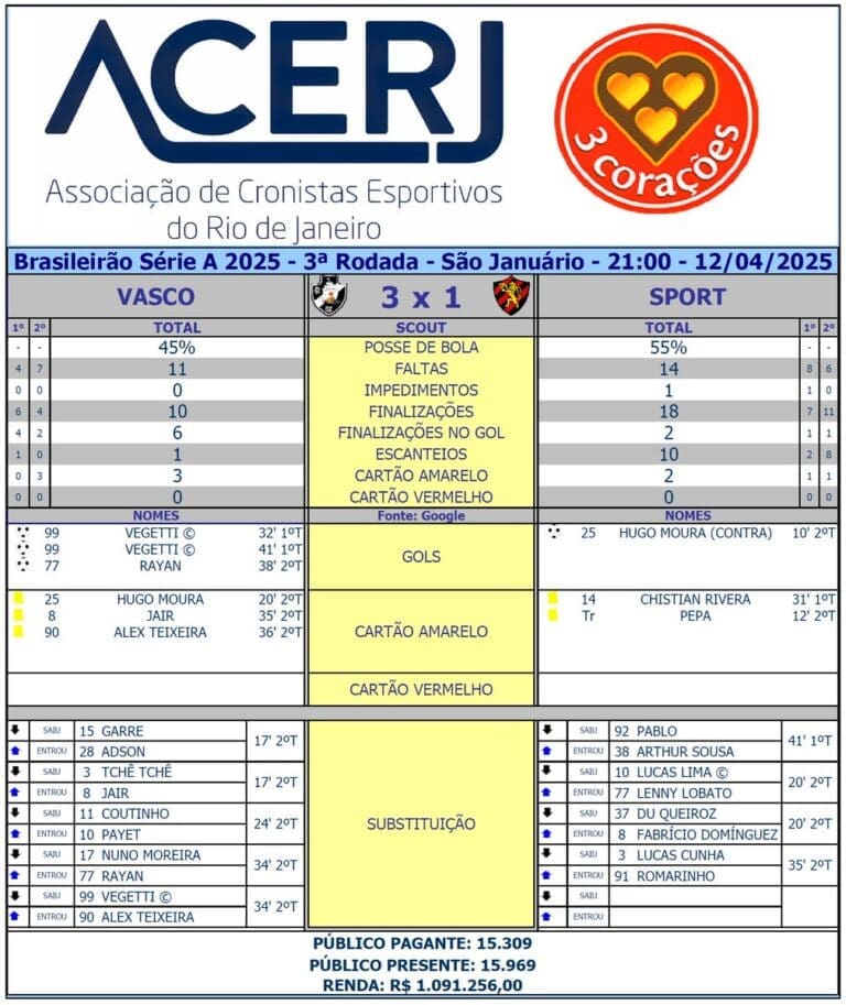 Análise Estatística do Jogo Vasco 3 x 1 Sport: Confira os Números! sábado, 12/04/2025 às 23:00 — Em Últimas notícias