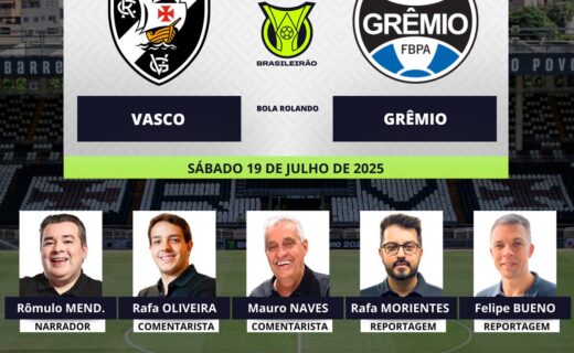 Conheça os profissionais encarregados da transmissão de Vasco x Grêmio. sábado, 19/07/2025 às 10:42 — Em Últimas notícias