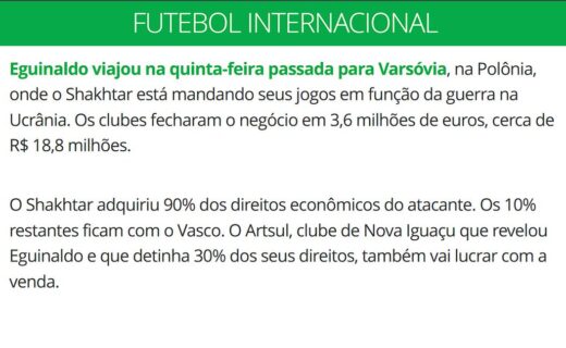 Vasco poderia detê-lo com apenas 10%, em vez dos 30% do passe de Eguinaldo. quarta-feira, 16/07/2025 às 07:01 — Em Últimas notícias