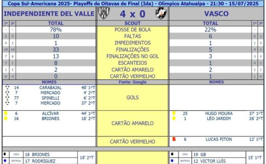 VASCO SOFRE UMA DERROTA PESADA PARA O INDEPENDIENTE DEL VALLE EM QUITO: 4 A 0 terça-feira, 15/07/2025 às 23:29 — Em Destaques