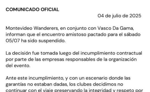 Montevideo Wanderers emite comunicado sobre a anulação do amistoso contra o Vasco. sexta-feira, 04/07/2025 às 18:57 — Em Últimas notícias