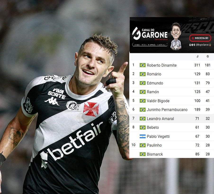 Vegetti iguala Bebeto no ranking dos goleadores do Vasco na Série A terça-feira, 17/06/2025 às 00:54 — Em Últimas notícias