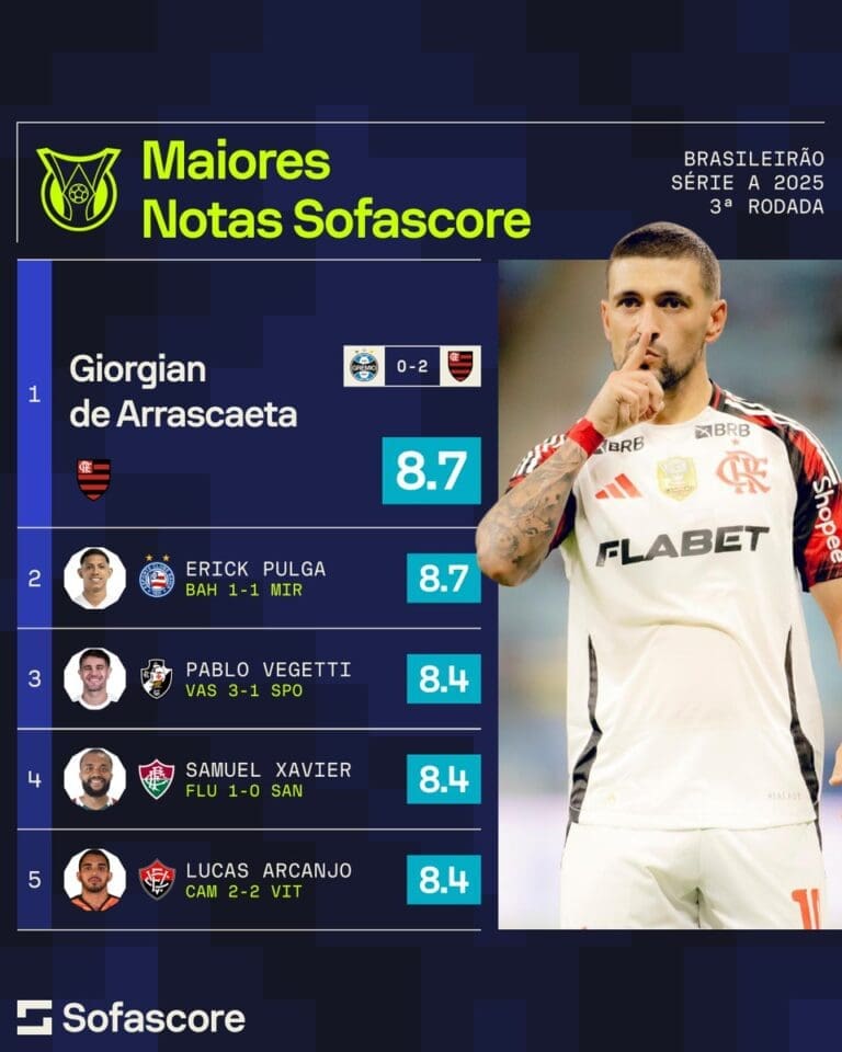 “João Victor, Nuno Moreira e Vegetti brilham na seleção Sofascore da 3ª rodada do Campeonato Brasileiro! Descubra mais!”