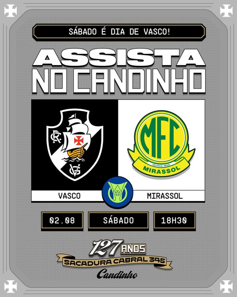 Centro Cultural Candinho disponibilizará telão para que os aficionados possam acompanhar Mirassol x Vasco. sábado, 02/08/2025 às 08:39 — Em Últimas notícias