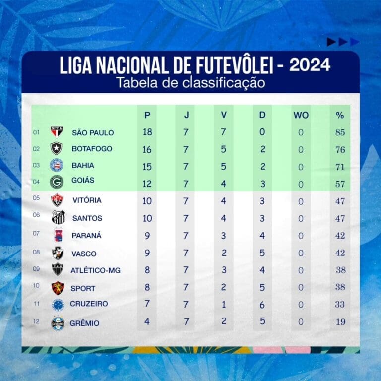 Futevôlei: Após 7 rodadas, o Vasco ocupa a 8ª posição na Liga Nacional domingo, 03/11/2024 às 21:27 — Em Futevôlei