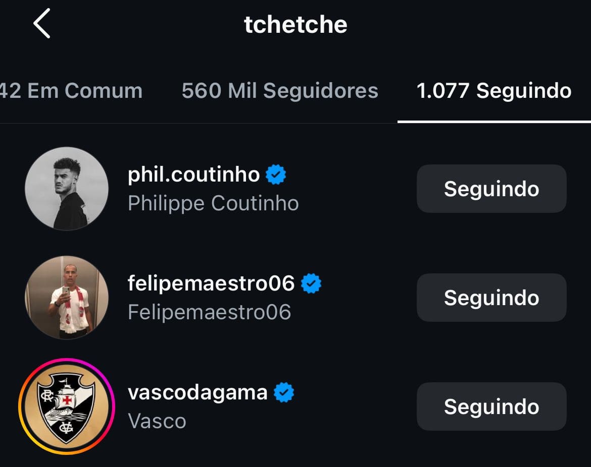 Tchê Tchê começou a seguir o Vasco no Instagram, e a expectativa é de que um anúncio oficial ocorra em breve.