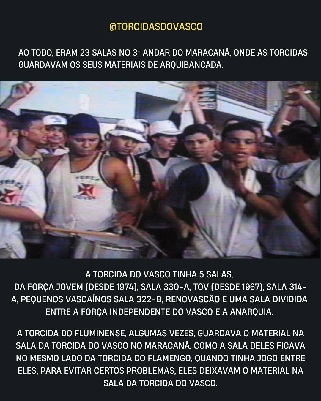 As salas do antigo Maracanã não apenas armazenavam os materiais das torcidas organizadas, mas também funcionavam como um ponto de encontro para as reuniões antes dos jogos. Esses espaços eram organizados de acordo com o tamanho das torcidas cariocas. A torcida do Vasco, por exemplo, contava com um total de cinco salas.