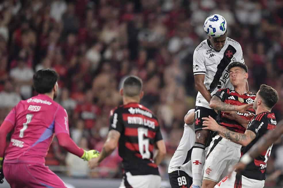 Rayan marca de cabeça em Flamengo x Vasco, no Brasileirão 2025 — Foto: Thiago Ribeiro/AGIF