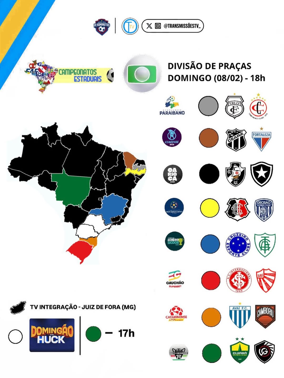 Vasco X Botafogo (Campeonato Carioca): a partida será exibida para o Rio de Janeiro, além de estados como Acre, Alagoas, Amapá, Amazonas, Bahia, Espírito Santo, Goiás, Maranhão, Mato Grosso do Sul, Pará, Piauí, Rio Grande do Norte, Rondônia, Roraima, Sergipe, Tocantins, Distrito Federal e também para a cidade mineira de Juiz de Fora.