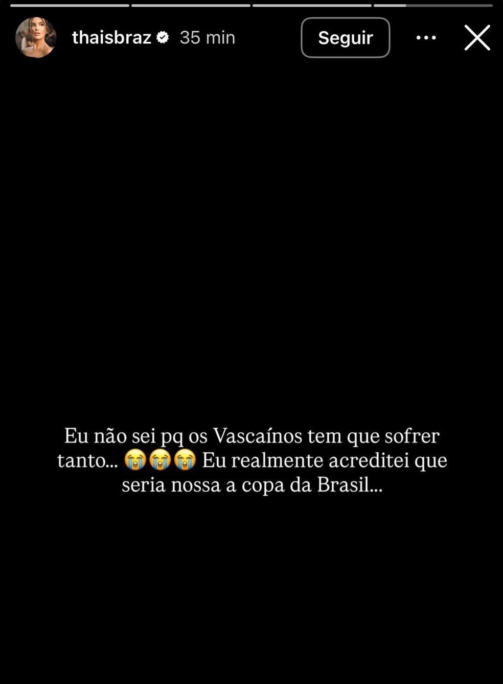 Thais Braz lamenta derrota do Vasco — Foto: Reprodução/Instagram