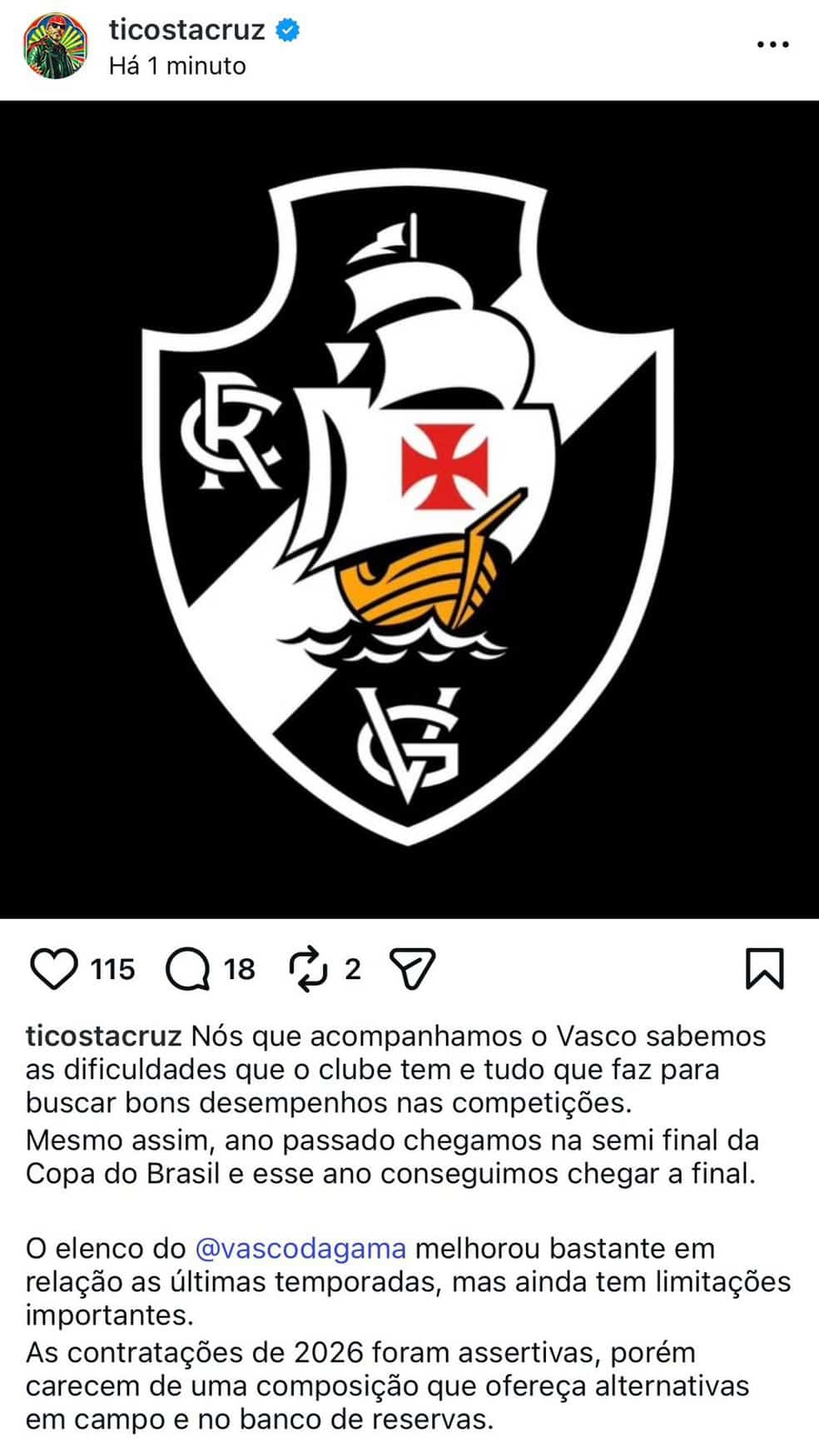 “O Vasco voltará a ter seus dias de glória”, escreveu o vocalista do Detonautas.