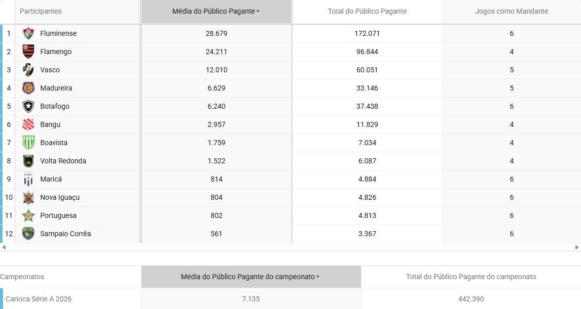 O ranking de público pagante do Campeonato Carioca de 2026 apresenta os seguintes números: