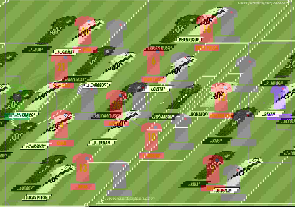 Uma falta feita por Philippe Coutinho foi evidente, mas a disposição do time em atacar estava confusa, dificultando aproximações e jogadas que caracterizam o estilo de Diniz. Gómez atuou muitas vezes como atacante central, enquanto Rayan abria pela direita, mas frequentemente sem apoio. Nuno Moreira e Matheus França apresentaram pouco efeito no ataque.