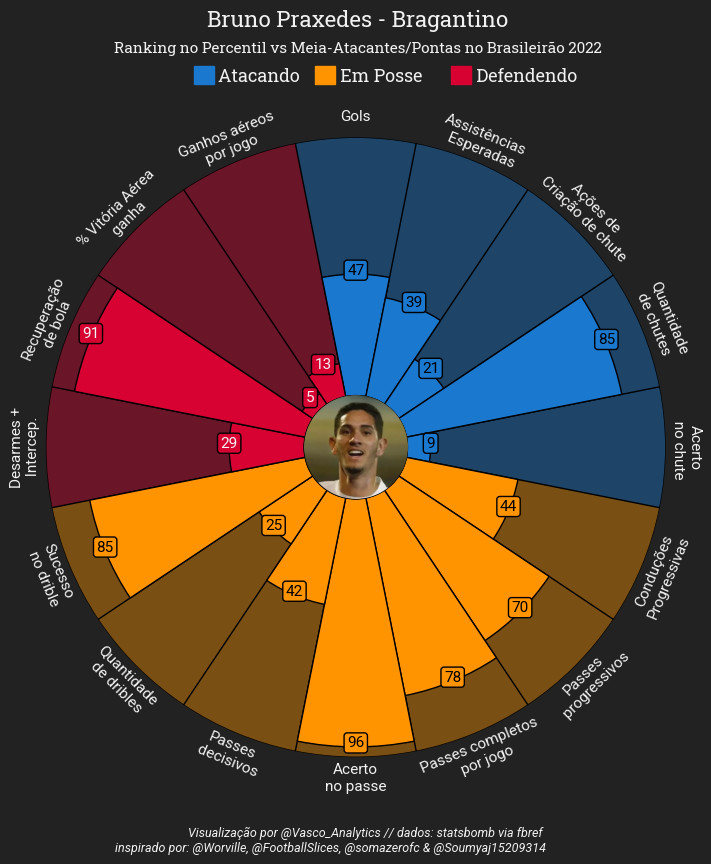 Trago aqui uma comparação em percentis do meio-campista com os outros jogadores de mesma função no Brasileirão 2022.