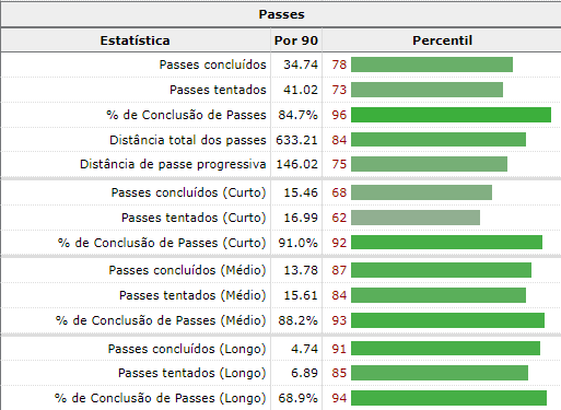 É um jogador interessante pela habilidade em organizar o meio campo através do seu volume e taxa de acerto nos passes curtos, médios e longos, como os dados abaixo indicam.