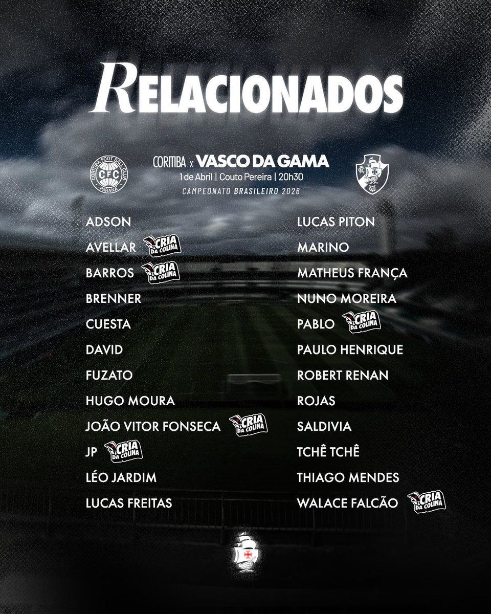 Vasco divulga relação de jogadores para o confronto contra o Coritiba.