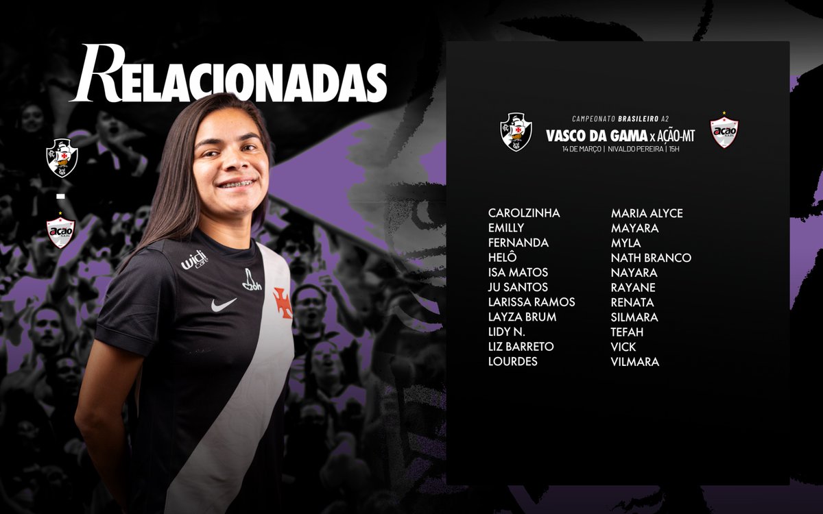 Vasco divulga relação de atletas para partida contra o Ação no futebol feminino.