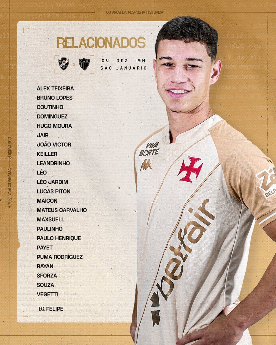 Vasco anuncia os jogadores convocados para a partida contra o Atlético-MG