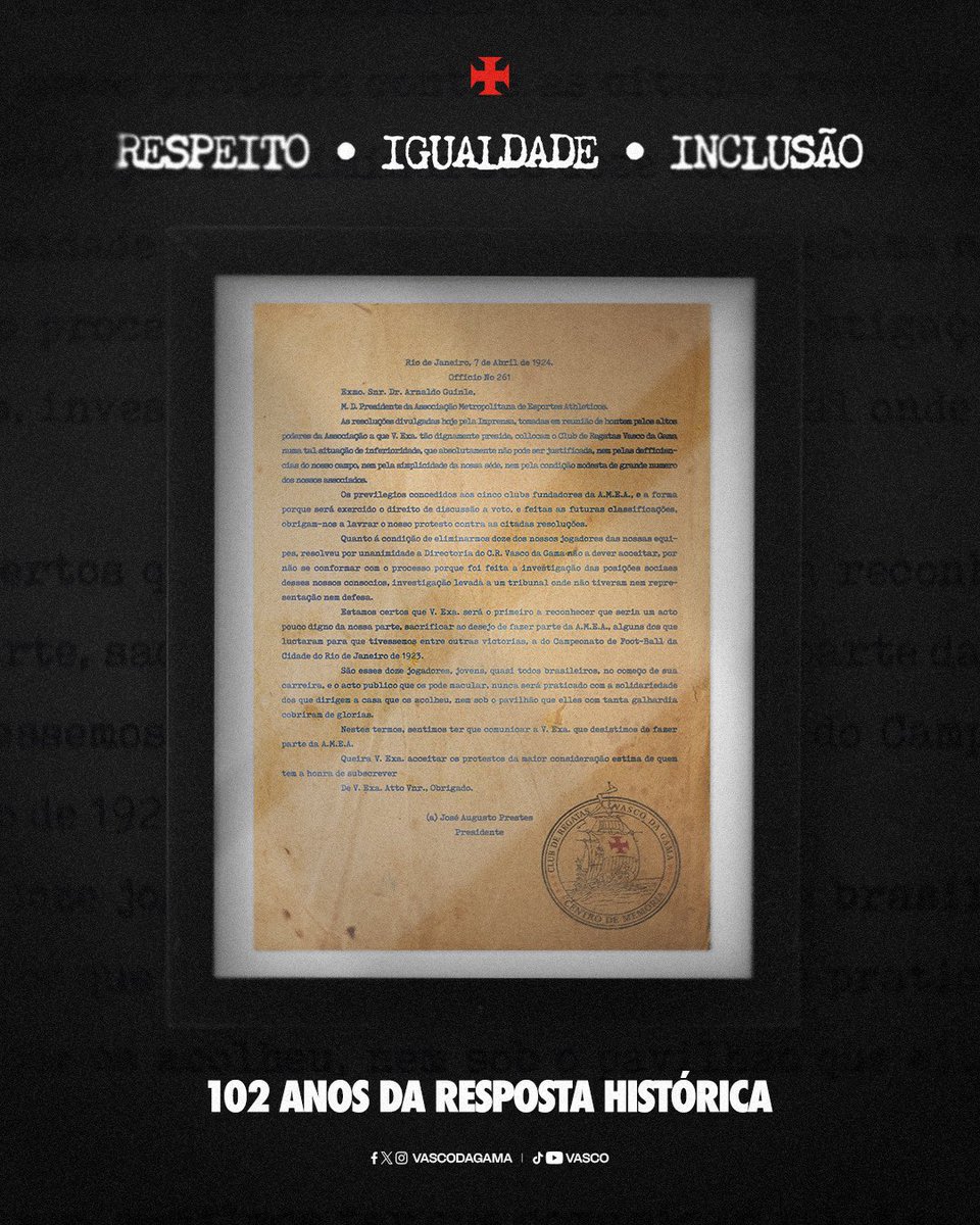 Vasco da Gama […] São esses doze jogadores, jovens, quase todos brasileiros, no começo de sua carreira, e o ato público que os pode macular, nunca será praticado com a solidariedade dos que dirigem a casa que os acolheu, nem sob o pavilhão que eles com tanta galhardia cobriram de glórias […]