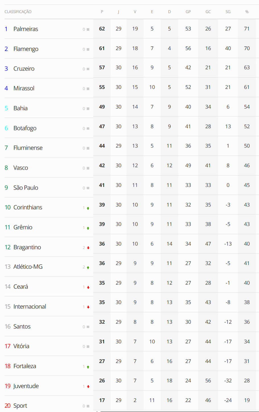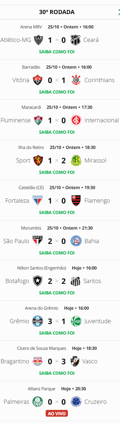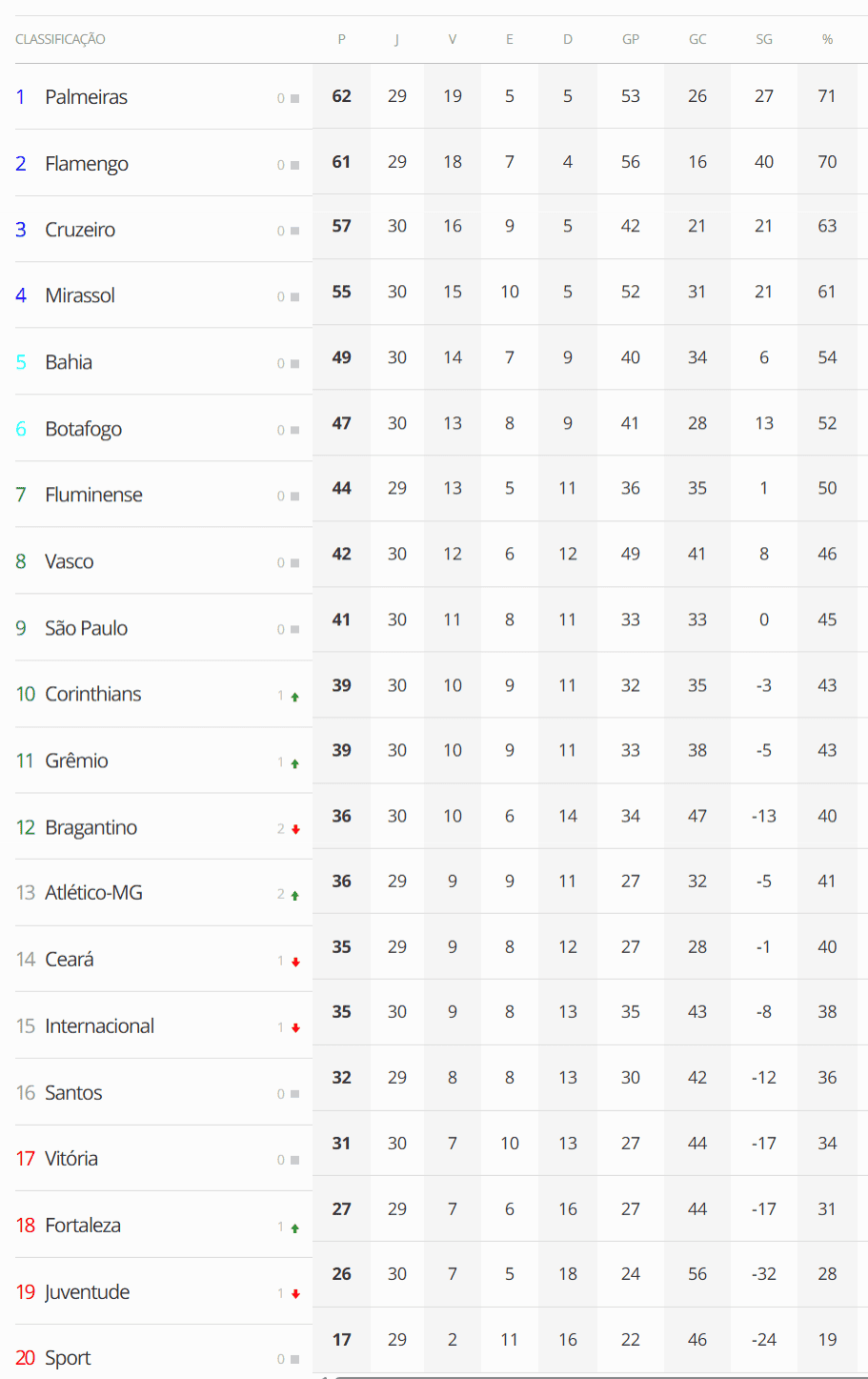 Terminada a 30ª rodada do Campeonato Brasileiro, o Vasco, após conquistar uma vitória convincente de 3 a 0 sobre o Red Bull Bragantino, ocupa a 8ª posição na tabela.