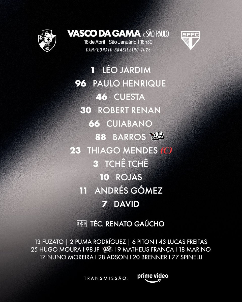 Vasco da Gama apresenta a escalação para o confronto desta noite.