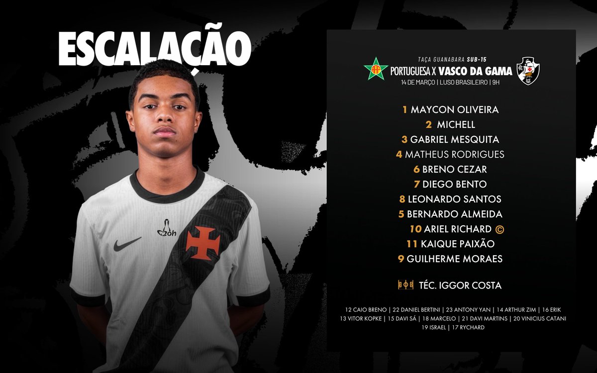 O Vasco anuncia a escalação para o confronto contra a Portuguesa no Sub-15.