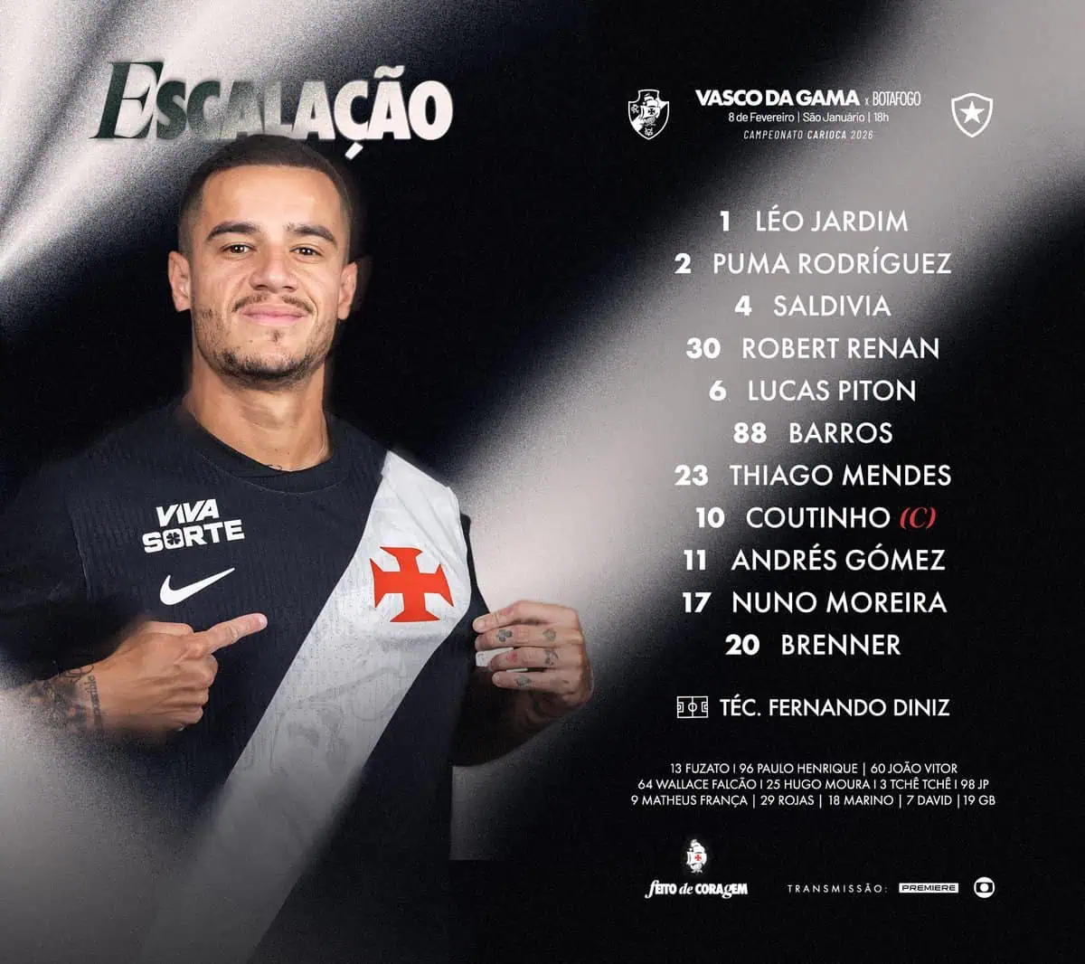 Vasco anuncia os jogadores que enfrentarão o Botafogo.