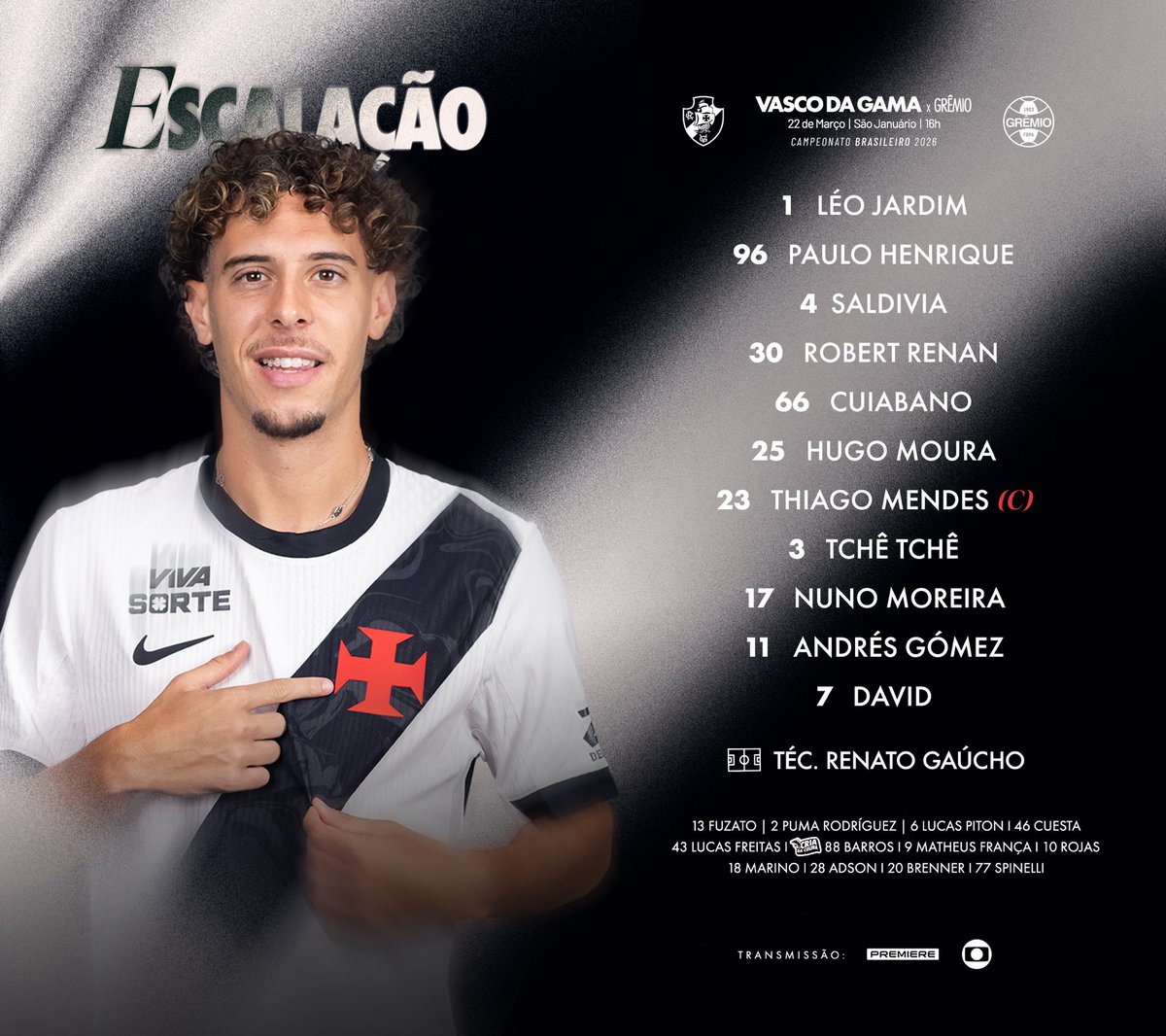 Vasco anuncia os jogadores que enfrentarão o Grêmio.
